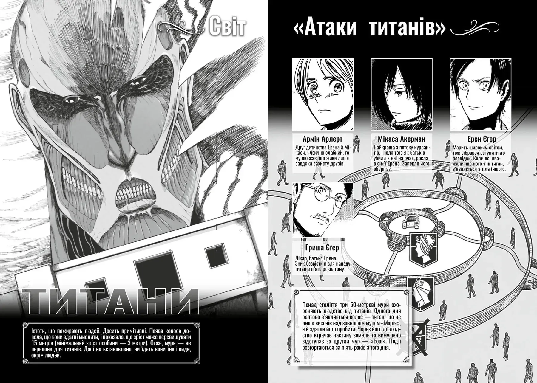 «Атака титанів» — темна фентезі-манґа, створена Хаджіме Ісаямою. Сюжет розгортається в постапокаліптичному світі, де залишки людства ховаються за трьома величезними стінами, щоб захиститися від жахливих істот — титанів. Історія розповідає про молодого хлопця Ерена та його друзів Мікасу та Арміна. Спокійне життя трійці руйнується, коли один із титанів прориває зовнішню стіну, дозволяючи монстрам увірватися у місто. Герої вступають до військового корпусу, щоб боротися з титанами, розкривають приголомшливі таємниці їхнього походження та дізнаються про природу світу, в якому вони живуть.