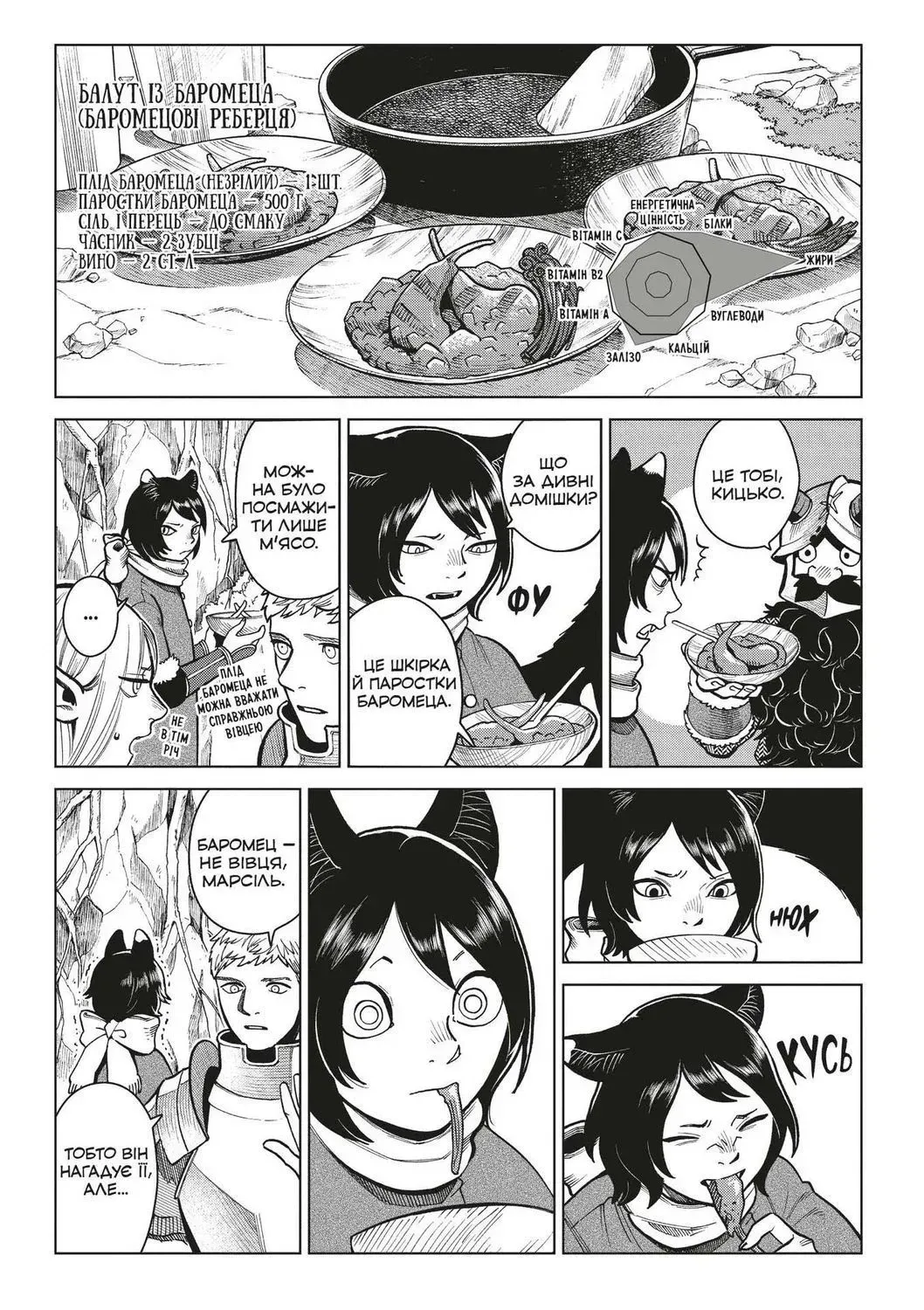 Перебирати харчами — смертельно небезпечно! Справжній пригодник їсть усе підряд. Нова учасниця гурту, кішка-нінджя Ідзуцумі, завдяки своїй спритності вправно нищить монстрів, проте її слабкість… примхливість у їжі! Ненавидить овочі! Ненавидить гриби! Ненавидить рибу! Та Лайосів гурт такої поведінки не терпітиме. Якщо прагнеш здолати підземелля, мусиш їсти все, що дають.