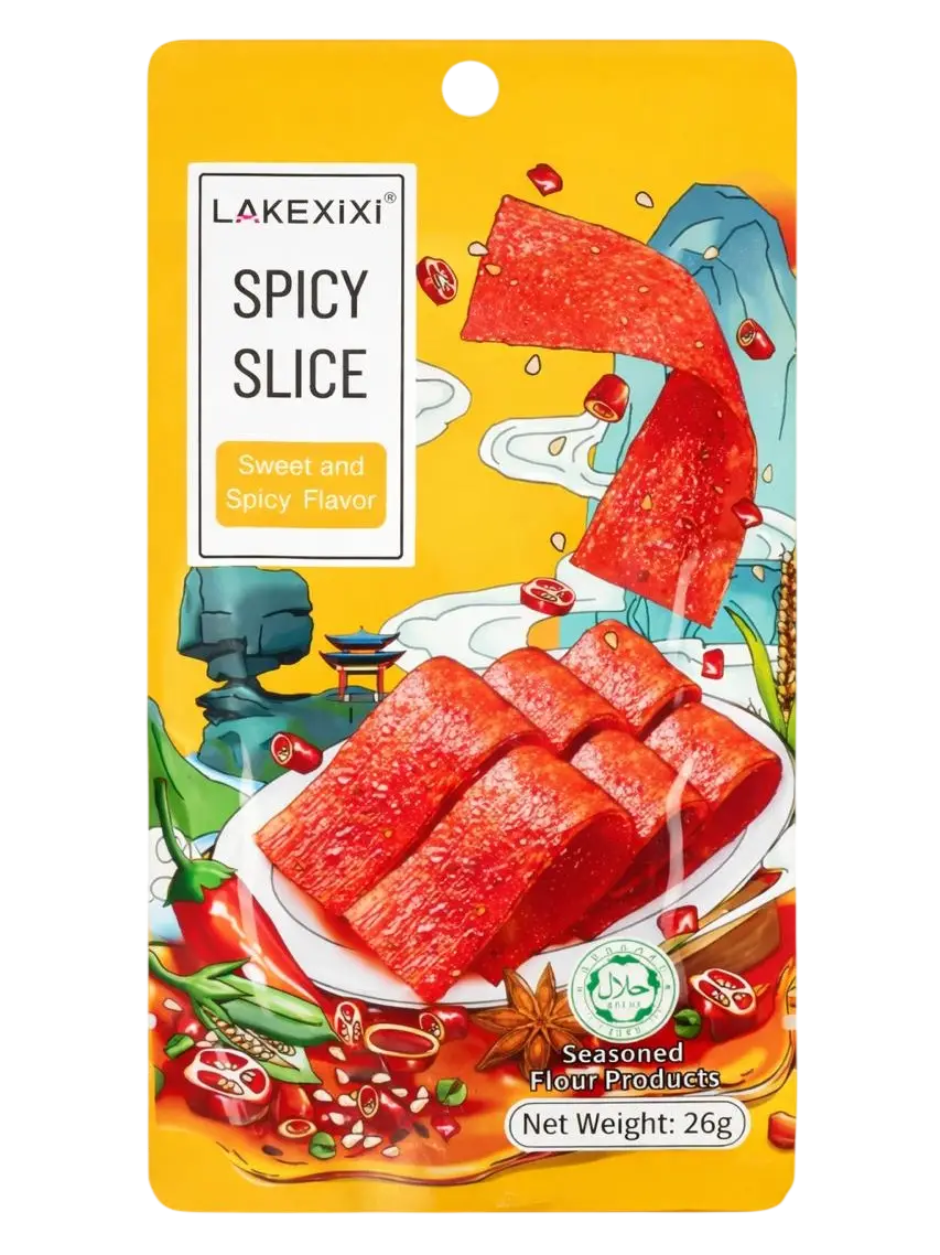 Снек LAKEXIXI Spicy Slice Sweet & Spicy — це популярний китайський латяо з пікантним солодко-гострим смаком. Тонкі еластичні слайси з пшеничного тіста щедро приправлені ароматним чилі, спеціями та соєвим соусом, що створює насичений азійський смаковий баланс. Такий снек має характерну пружну текстуру і яскраву гостроту, яку люблять фанати китайських стріт-фуд закусок. Ідеально підходить як швидкий перекус, до напоїв або для знайомства з популярними китайськими снеками. Зручна упаковка дозволяє легко взяти латяо з собою в дорогу або на роботу.